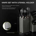 - ALL-IN-ONE KNIFE SET: The set includes 8″ bread knife, 8″ chef’s knife, 7″ Santoku knife, 5.5″ serrated utility knife, 5″ utility knife, 6 pieces of 4.5″ steak knives, 3.5″ paring knife, kitchen shears, knife block with built-in knife sharpener, and 6 kitchen utensils for all your kitchen needs.